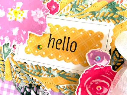 I then adhered the flowers at the upper left and bottom right and placed Polished Pink jewels as the stamen of the flowers, a Fresh Freesia jewel on the small bud on the bottom right, with 3 large Pale Papaya jewels in the center of the large Fresh Freesia flower.