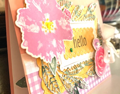 I started out with a landscape Blushing Bride card base and started stamping and cutting away to build this up by layers. I cut the DSP panels and frames first of the Fresh Freesia gingham print with the So Saffron mats and sentiment panel from the Scalloped Contoured Dies.