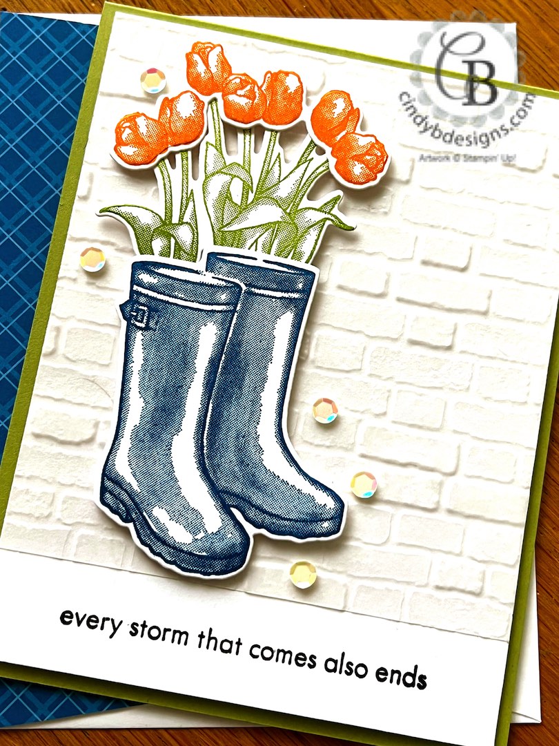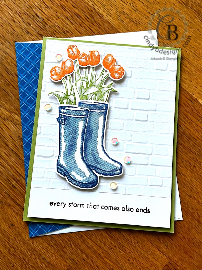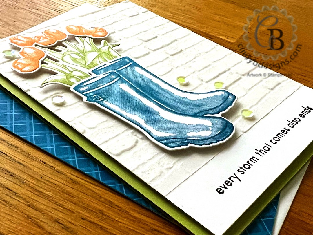 The sentiment was stamped at bottom center from the Flowering Rain Boots Bundle with Memento Tuxedo Black ink.
