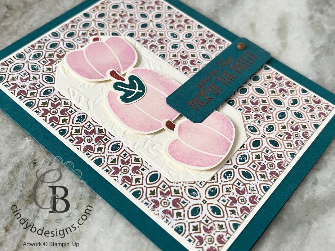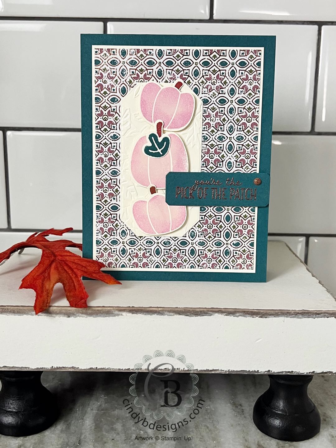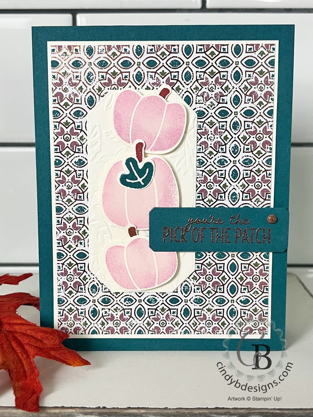 My colors today are Moody Mauve, Pretty Peacock, Pecan Pie, and copper but, I stamped the pumpkins in alternative colors.