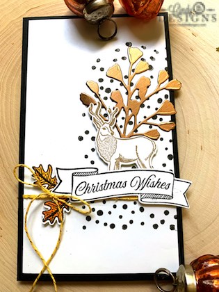The large fern was die-cut from Forever Greenery from Brushed Copper Metallic Cardstock and adhered to the card base with Liquid Adhesive. The Crumb Cake deer was stamped from Wishes & Wonder stamp set with the North Pole Wonder Dies; both from the Wishes & Wonder Bundle, which is a part of the Wonder of the Season Suite. The stamped leaves are from the Beautiful Autumn Bundle with the banner and sentiment that carried over from last year’s Toile Christmas stamp set and Christmas Cardinals Dies.