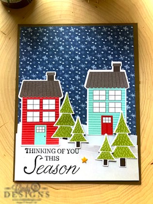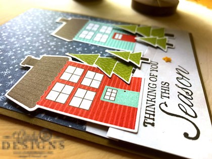I had one thing in mind, wasn’t paying attention that I used the exact same house twice, but in different colors, and that’s when I decided I am stretched too thin right now. The trees and houses are die-cut from the DSP, which makes this a less than 5-minute project to make. The suite has everything you need, including the slopes that I stamped the sentiment on from Feels Like Frost 6 x 6 DSP, which carried over from last year. I would love to see this product suite carry over, as there are so many uses for it after the holidays. The sentiment is from Winter Woods.