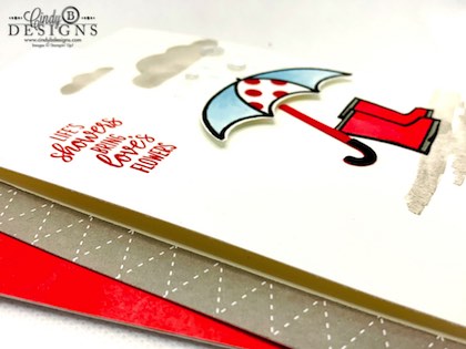 An image from Waterfront was used as a “puddle.” The clouds are stenciled in from Pattern Party Decorative Masks with Gray Granite ink and a Sponge Dauber. The raindrop image was stamped off once in Balmy Blue. The galoshes are colored in with the Real Red Stampin’ Blends Combo Pack. The top and bottom of the boots were filled in with a Gray Granite Stampin’ Write Marker from the Neutrals set and then fussy cut.