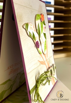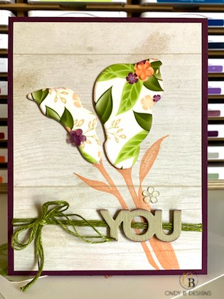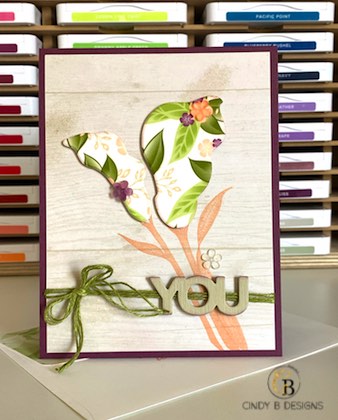 The stems are in Petal Pink ink. I took one of the vellum floral patterns from Floral Romance, adhered it to Whisper White CS with a Multipurpose Adhesive Sheet, and die-cut it out with the Lily Framelits. I added Froster Flower Embellishments on the lilies for a little fun on top of their DSP coordinating flowers. I love working with vellum. I tied Old Olive Linen Thread, which really should be a staple, wrapped it around the DSP the 3x, and did a cheater bow. The die-cut YOU is from Celebrate You Thinlets 3x with Sahara Sand CS, stacked, and lightly inked around the edges with Fresh Fig so it wouldn’t fade into the background.